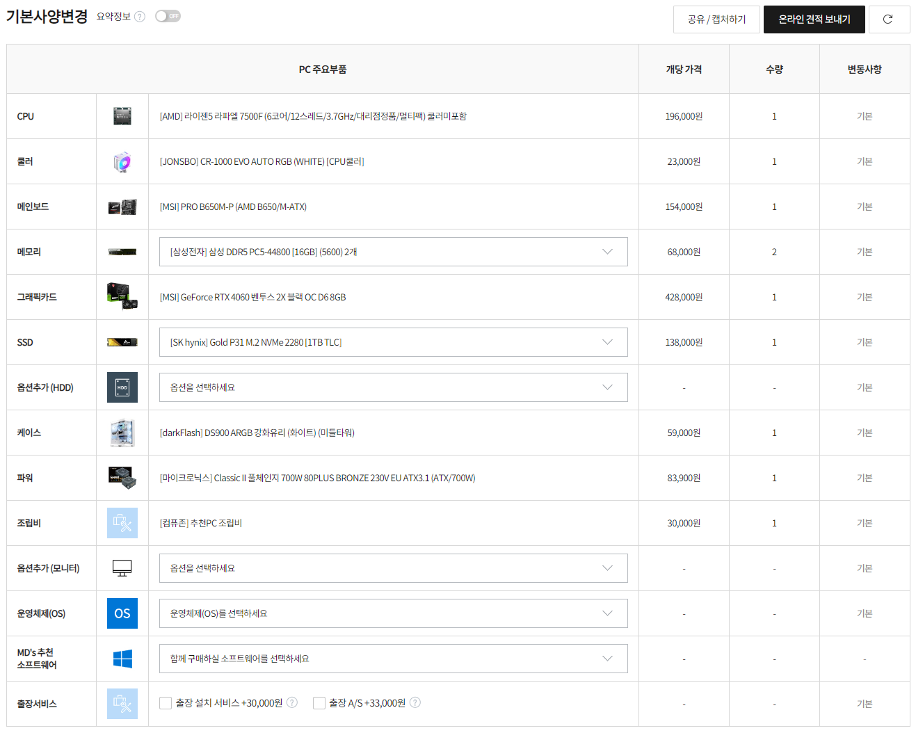 선택 이유 1. 조립 견적 따로 내기 귀찮음, 성능은 볼줄 알기에 충분히 가성비 좋다고 생각