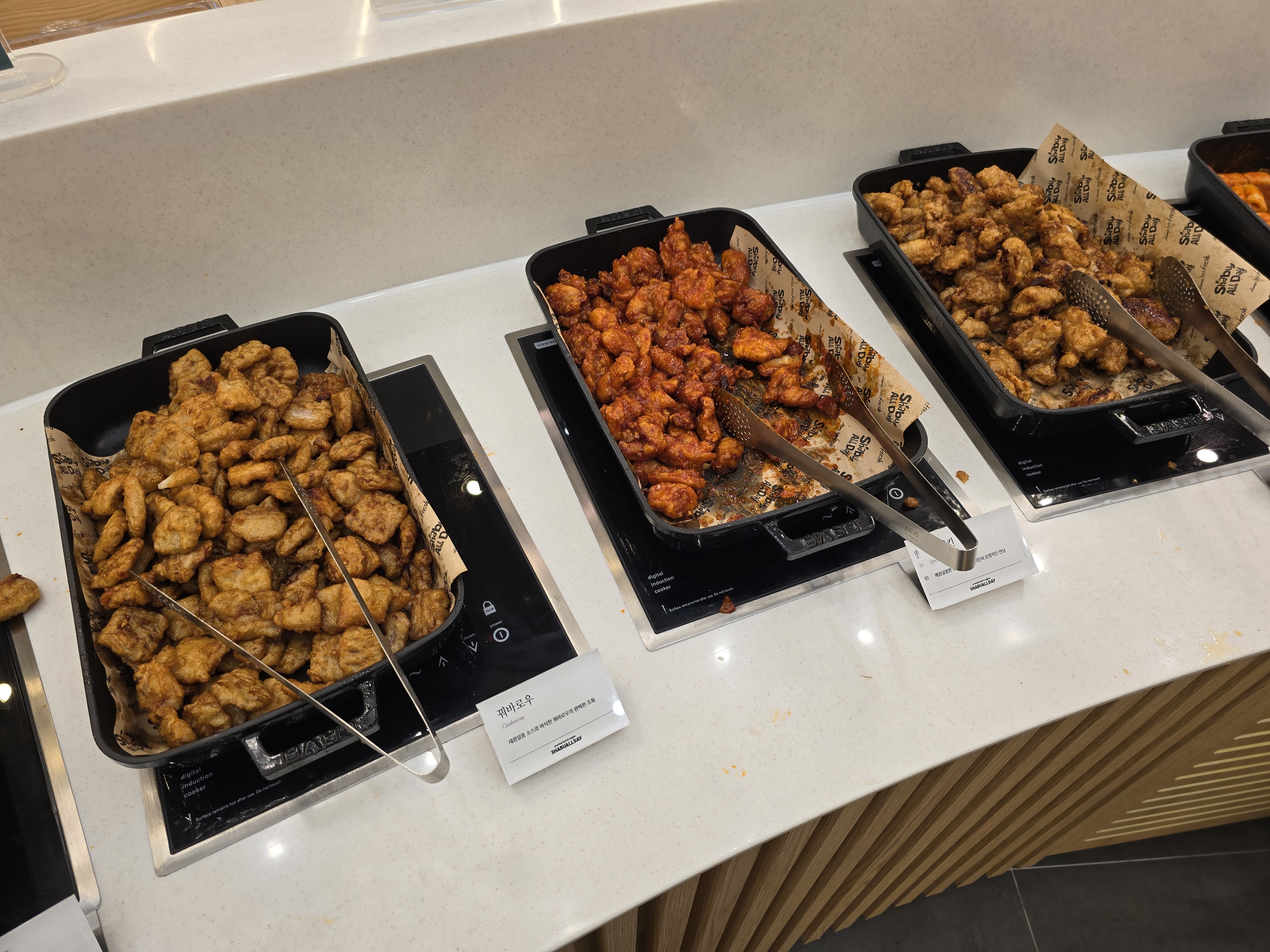 양념치킨, 간장치킨, 꿔바로우, 윙봉, 피자, 파스타, 미나리 삼겹살, 튀김, 초콜릿 분수.. 대체 없는게 뭔가요 게다가 다 맛있어요
