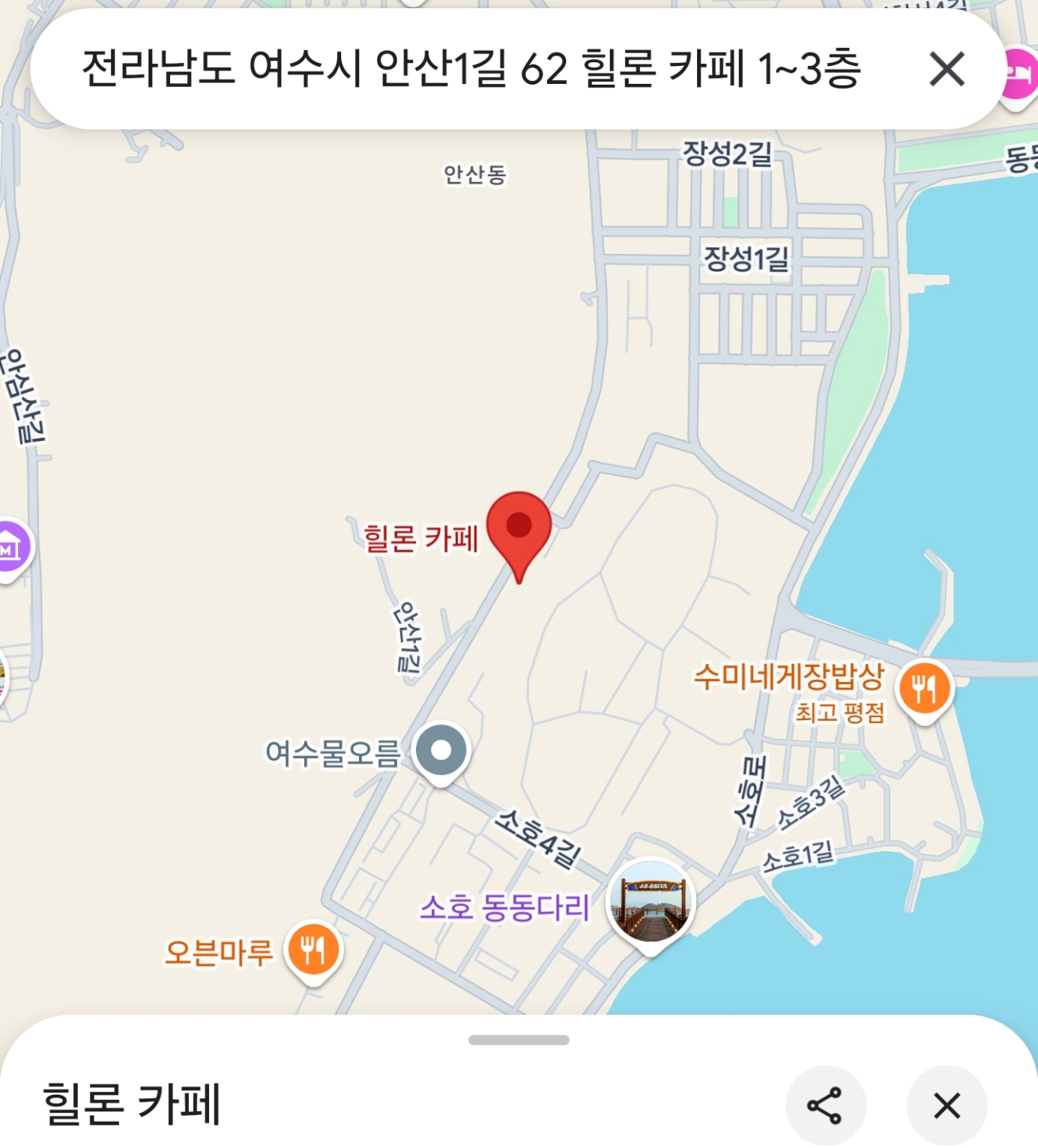 위치는 여기인데요! 소호동 꼭대기 쪽에 있어서 여수 바다가 아주 시원하게 다 보이는 구조에요