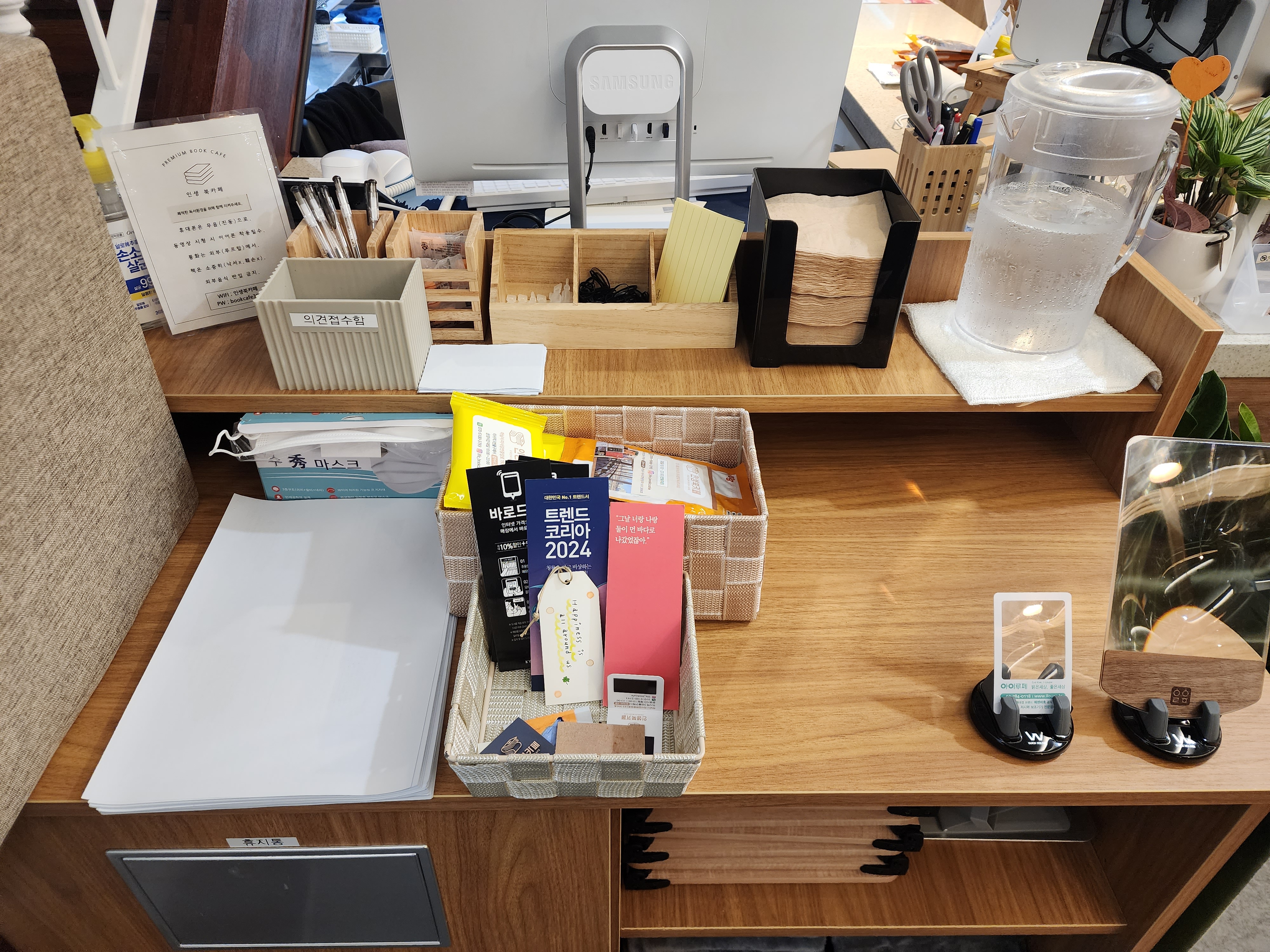 셀프바에 가보면 포스팃, 펜, A4용지, 독서대, 인공눈물까지 준비되어 있는데 사장님 센스에 감탄했어요